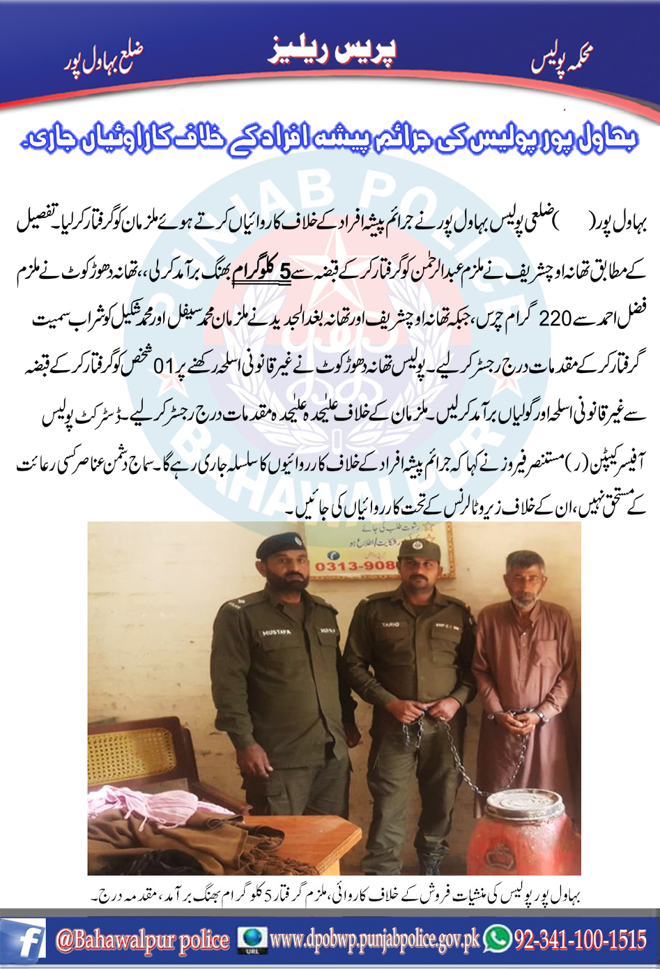 بہاولپور پولیس کی منشیات فروش کے خلاف کاروائی ، ملزم گرفتار ، چرس برآمد ، مقدمہ درج