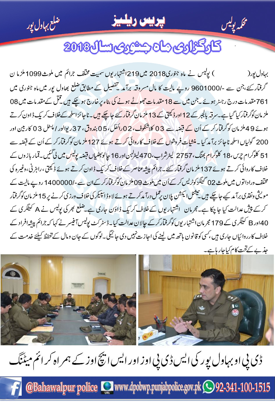 بہاولپور پولیس نے ماہِ جنوری 2018 میں 219 اشتہاریوں سمیت مختلف جرائم میں ملوث 1099 ملزمان کرکے مال مسروقہ برآمد۔