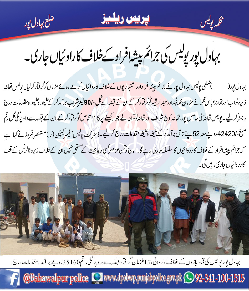 بہاولپور پولیس کی جرائم پیشہ افراد کے خلاف کارواییاں جاری۔