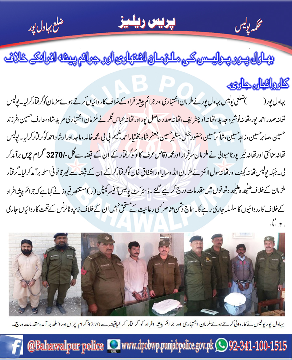 بہاولپور پولیس کی جرائم پیشہ افرادکے خلاف کارواییاں جاری ، ملزمان گرفتار،مقدمات درج۔
