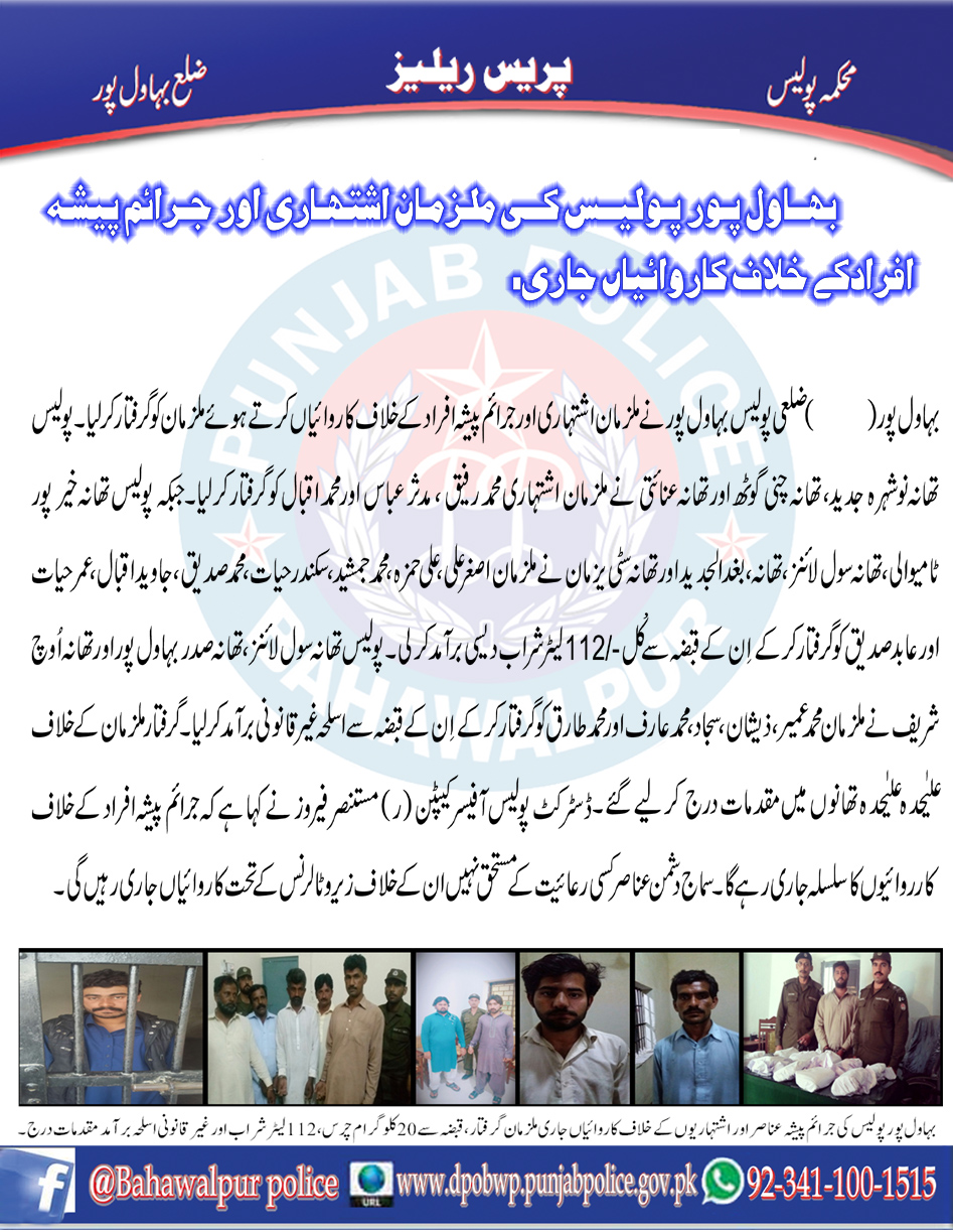 بہاولپور پولیس نے جرائم پیشہ افرادکے خلاف کاروائی کرتے ہوۓ ملزمان کو گرفتار کرلیا ،مقدمات درج