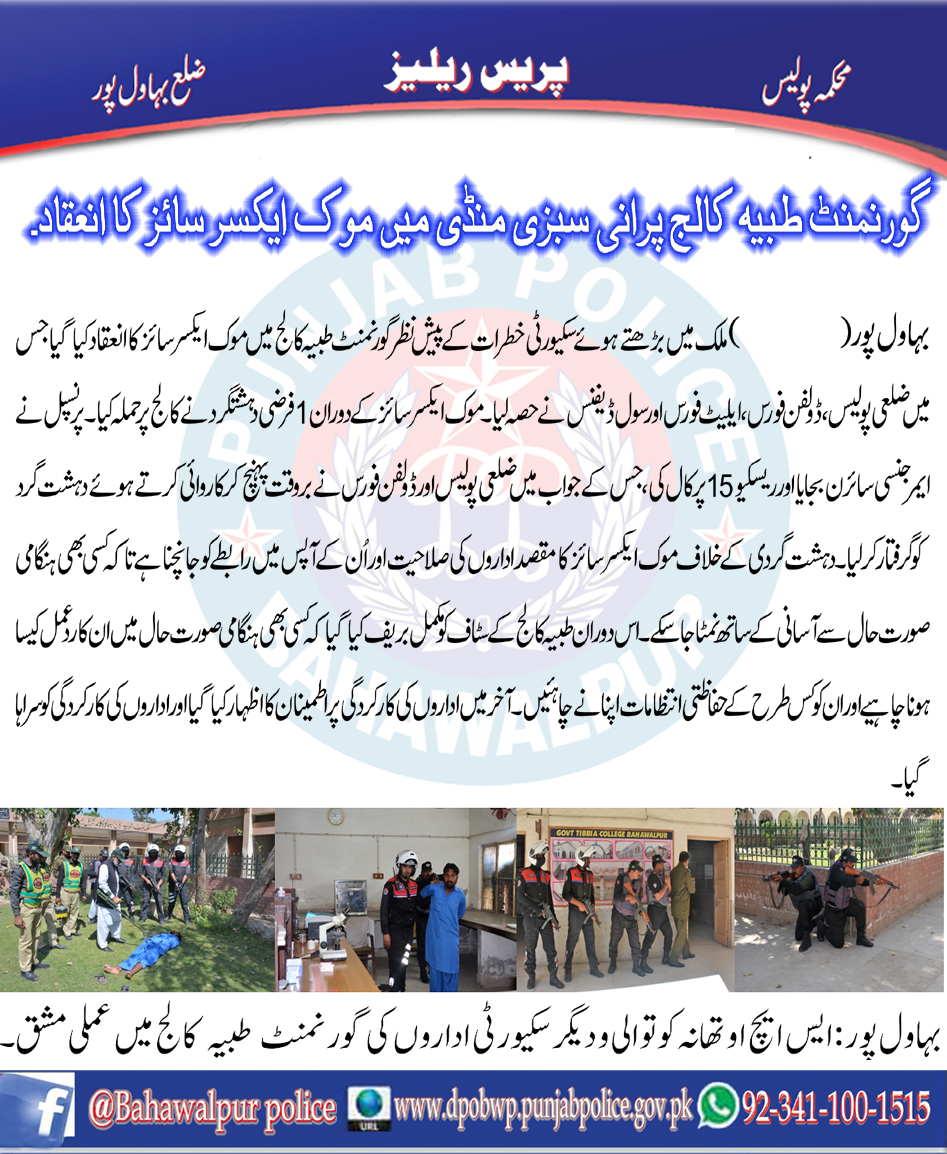 ملک میں بڑھتے ہوۓ سکیورٹی خطرات کے پیش نظر گورنمنٹ طبیہ کالج پرانی سبزی منڈی میں موک ایکسر سائز کاانعقاد جس میں ضلعی پولیس،ڈولفن فورس ،ایلیٹ فورس اورسول ڈیفنس نے حصہ لیا۔
