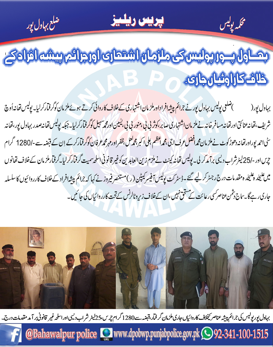 بہاولپور پولیس نے ملزمان اشتہاری اورجرائم پیشہ افرادکے خلاف کاروائی کرتے ہوۓ ملزمان کو گرفتار کرلیا ،مقدمات درج۔