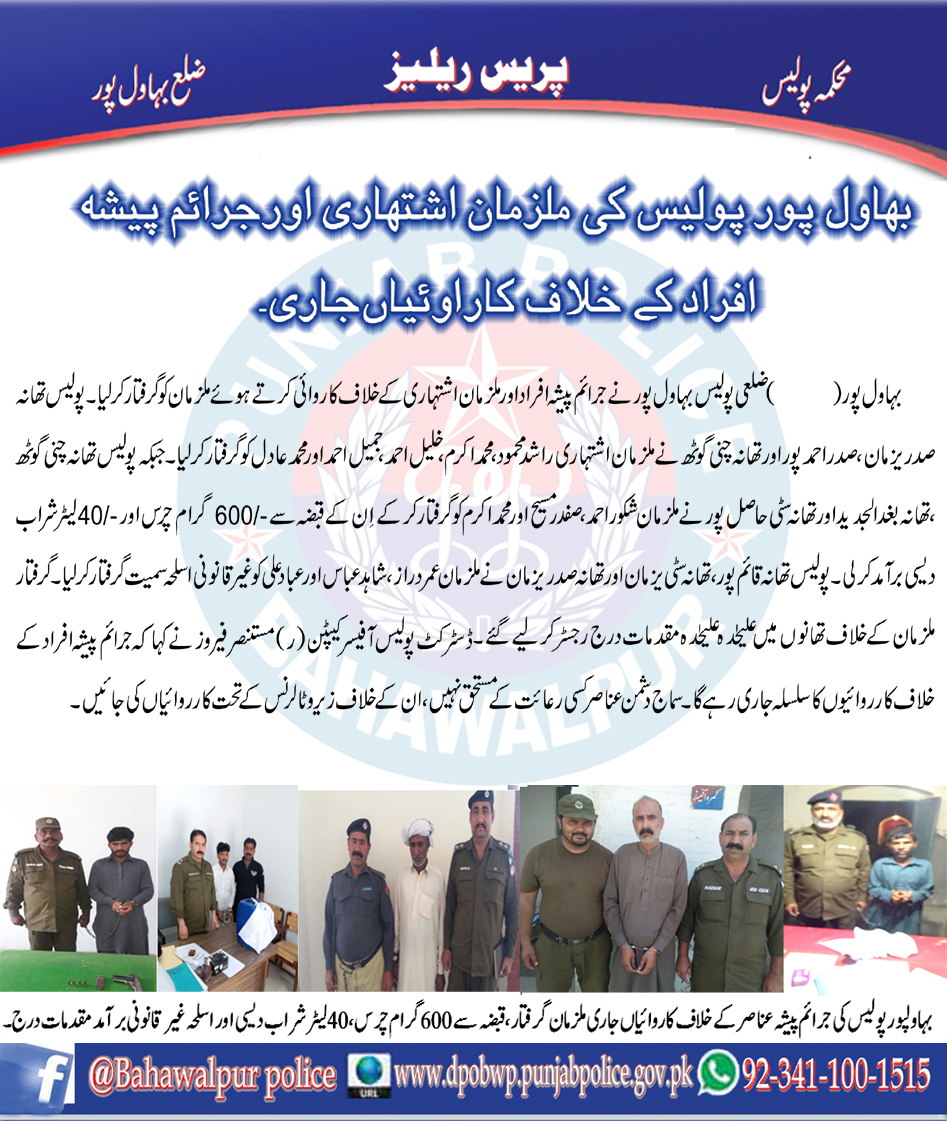 بہاولپور پولیس نے ملزمان اشتہاری اورجرائم پیشہ افرادکے خلاف کاروائی کرتے ہوۓ ملزمان کو گرفتار کرلیا ،مقدمات درج۔
