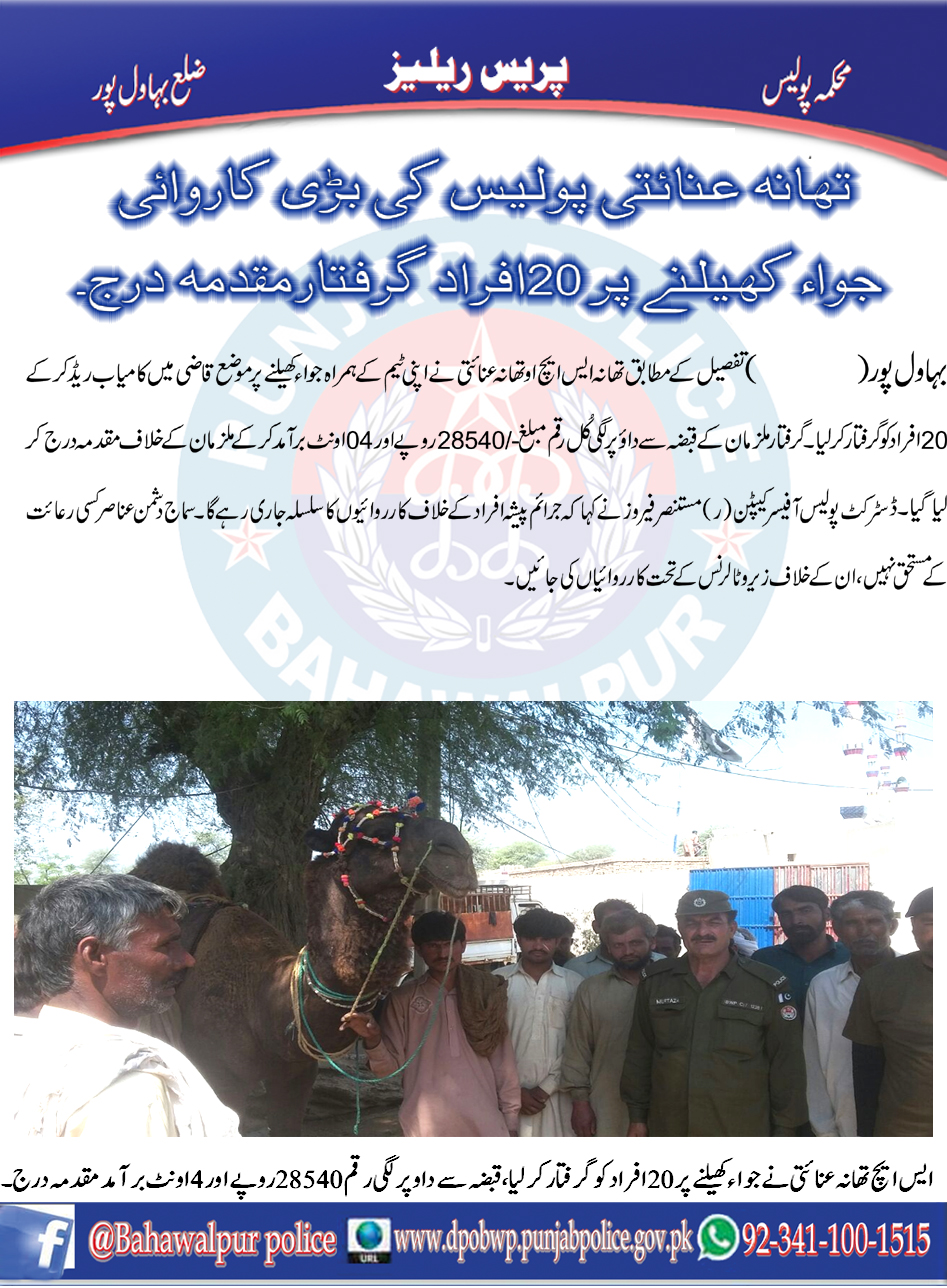 تھانہ عنائیتی پولیس کی کاروائی جواء کھیلنے پر 20افرادگرفتار،مقدمہ درج۔