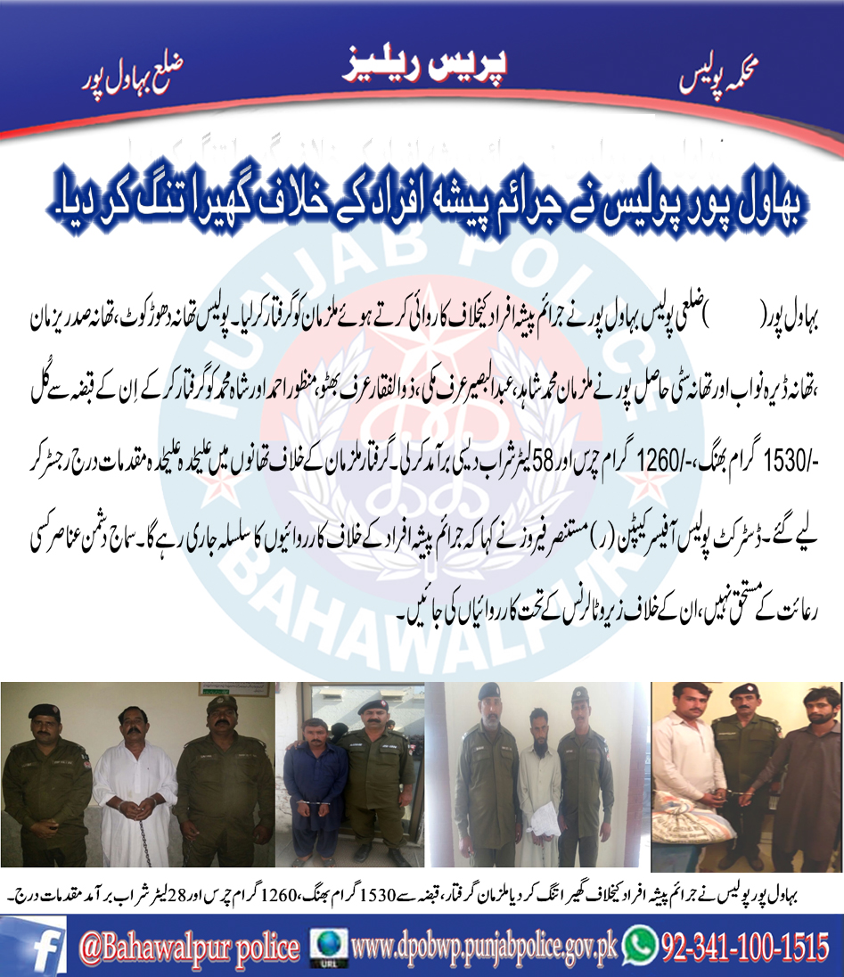بہاولپور پولیس نے ملزمان اشتہاری اورجرائم پیشہ افرادکے خلاف کاروائی کرتے ہوۓ ملزمان کو گرفتار کرلیا ،مقدمات درج۔
