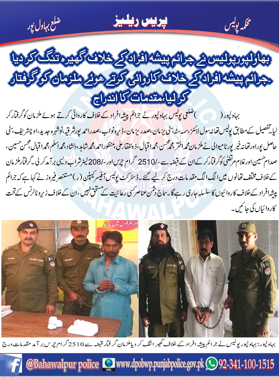 بہاولپور پولیس نے جرائم پیشہ افرادکے خلاف کاروائی کرتے ہوۓ ملزمان کو گرفتار کرلیا ،مقدمات درج۔