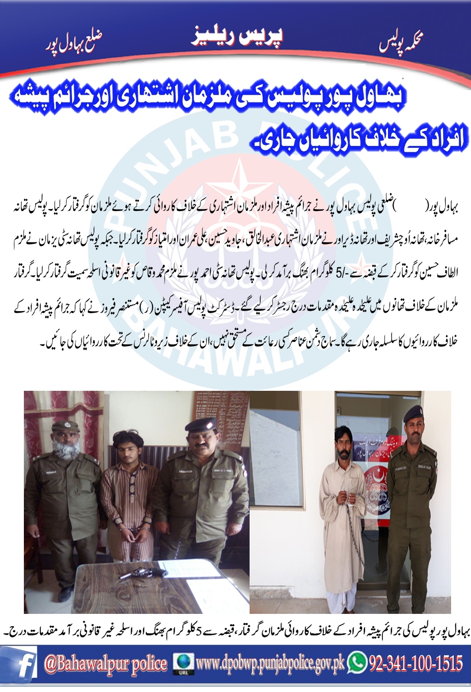 بہاولپور پولیس کی اشتہاری مجرمان اور جرائم پیشہ افراد کے خلاف کاروائی کرتے ہوۓ ملزمان کو گرفتار کرلیا ،مقدمات درج۔