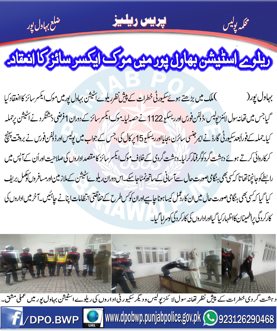 ملک میں بڑھتے ہوۓ سکیورٹی خطرات کے پیش ریلوے اسٹیشن بہاولپور پر موک ایکسر سائز کا انعقاد ۔