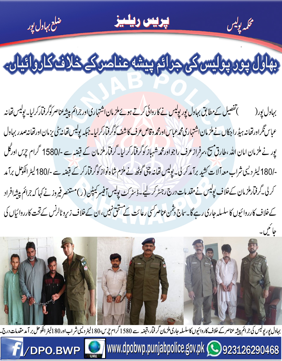 بہاولپور پولیس کی ملزمان اشتہاری اور جرائم پیشہ عناصر کے خلاف کاروائیاں جاری،ملزمان گرفتار،مقدمات درج۔