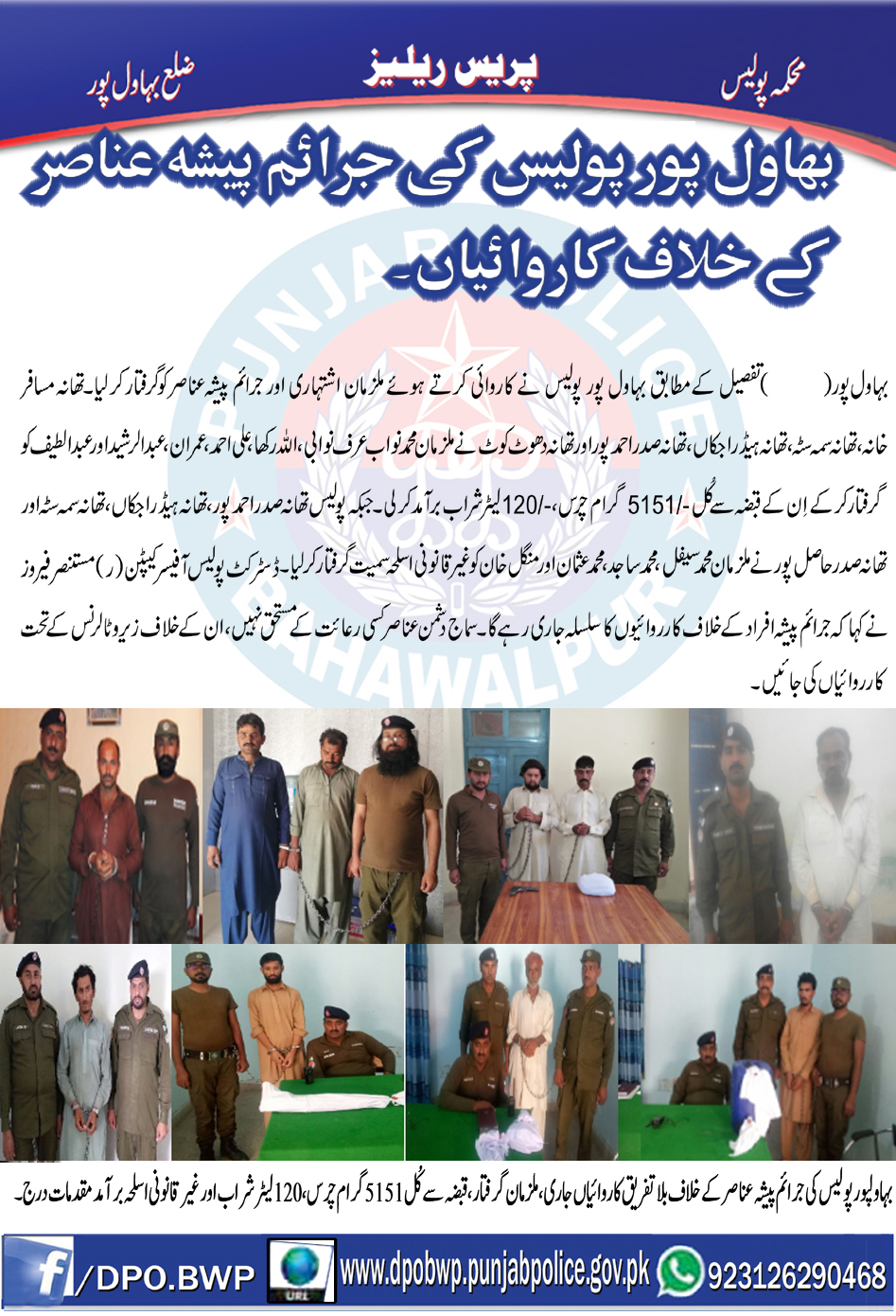بہاولپور پولیس کا جرائم پیشہ عناصر و اشتہاری ملزمان اور ناجائز اسلحہ رکھنے والوں کے خلاف کاروائیاں جاری، ملزمان گرفتار، منشیات برآمد ، مقدمات کا اندراج ۔۔
