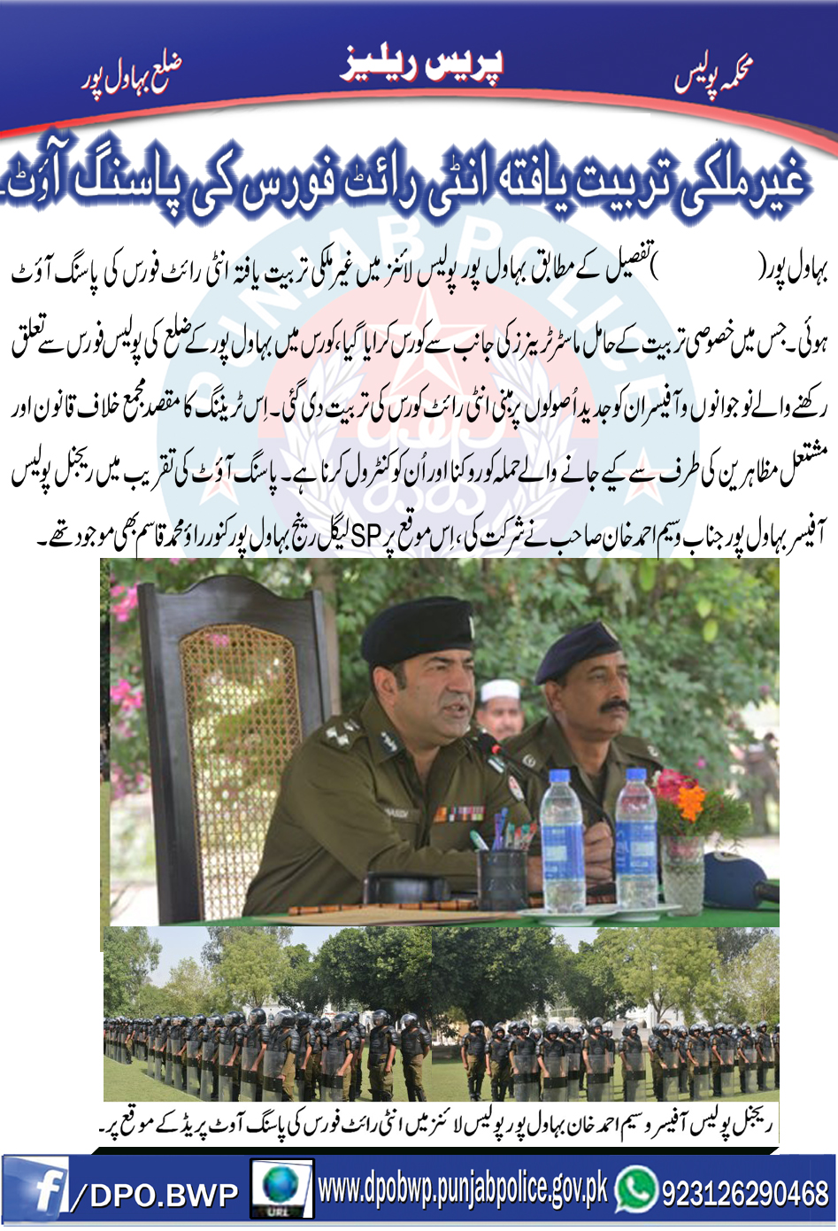 پولیس لائن بہاولپور میں اینٹی رائٹ فورس کی پاسنگ آؤٹ تقریب ہوئی ۔ جس میں ریجنل پولیس آفیسر وسیم احمد خان نے خصوصی شرکت کی ایس پی لیگل رینج بہاولپور کنور محمد قاسم ہمراہ موجود ۔