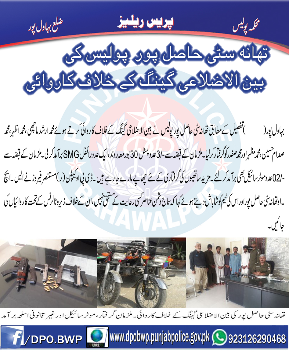 تھانہ سٹی حاصلپور پولیس کی کاروائی ،بین الاضلاعی گینگ کے 5 ارکان گرفتار ۔ 2موٹرسائیکل وغیر قانونی اسلحہ برآمد ،