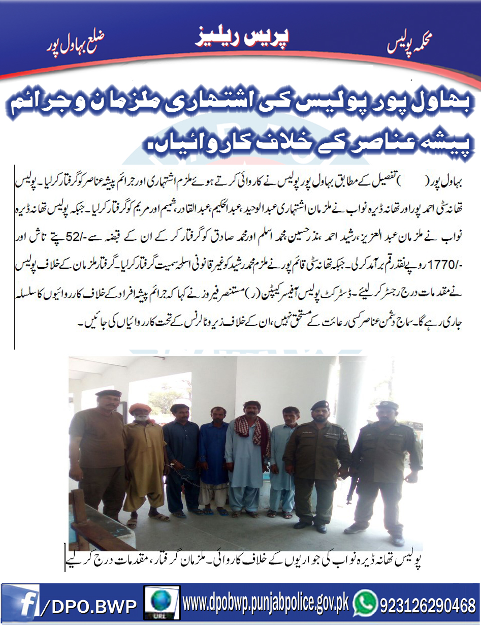بہاولپور پولیس کی اشتہاری ملزمان و جرائم پیشہ عناصر کے خلاف کاروائیاں جاری۔ غیرقانونی اسلحہ برآمد،ملزمان گرفتار،مقدمات اندراج ۔