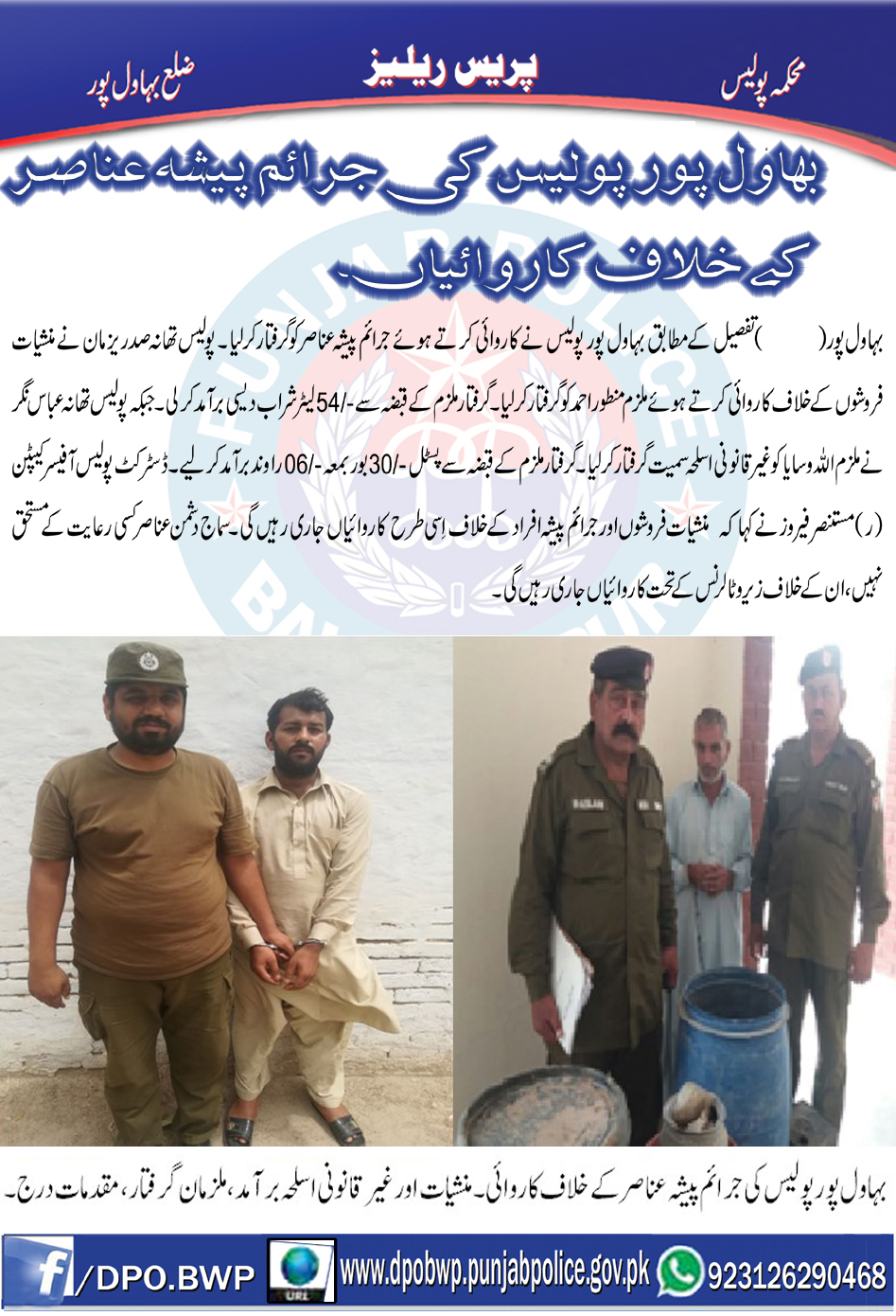 بہاولپور پولیس کی اشتہاری ملزمان و جرائم پیشہ عناصر کے خلاف کاروائیاں جاری۔ غیرقانونی اسلحہ برآمد،ملزمان گرفتار،مقدمات اندراج ۔
