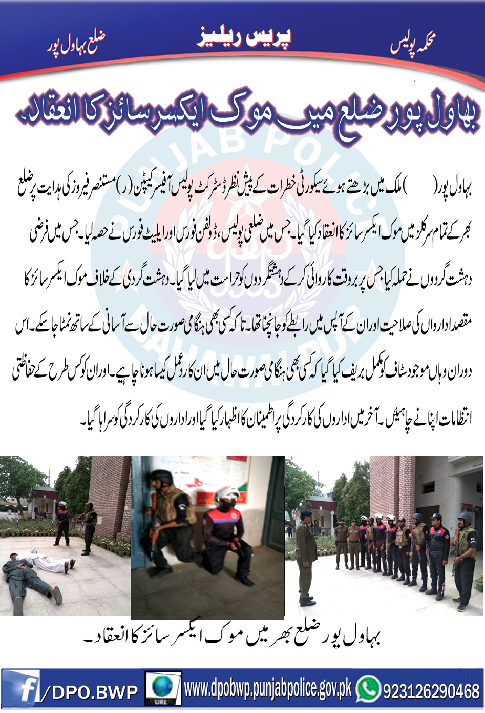 ملک میں بڑھتے ہوۓ سکیورٹی خطرات کے پیش نظر بہاولپور کے تمام سرکل میں موک ایکسر سائز کا انعقاد ۔