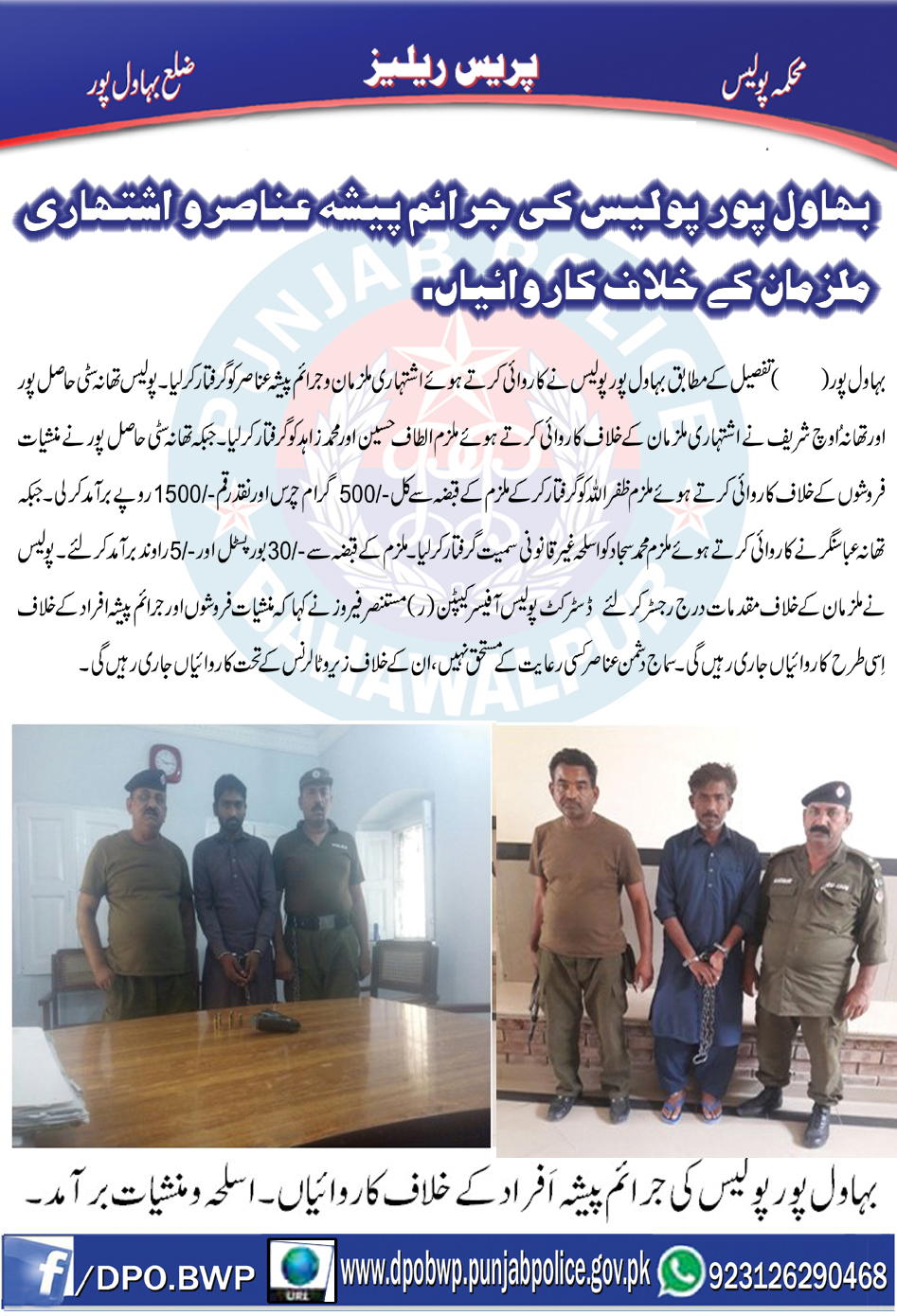 بہاولپور پولیس کی اشتہاری ملزمان و جرائم پیشہ عناصر کے خلاف کاروائیاں جاری۔ ملزمان گرفتار،مقدمات اندراج ۔