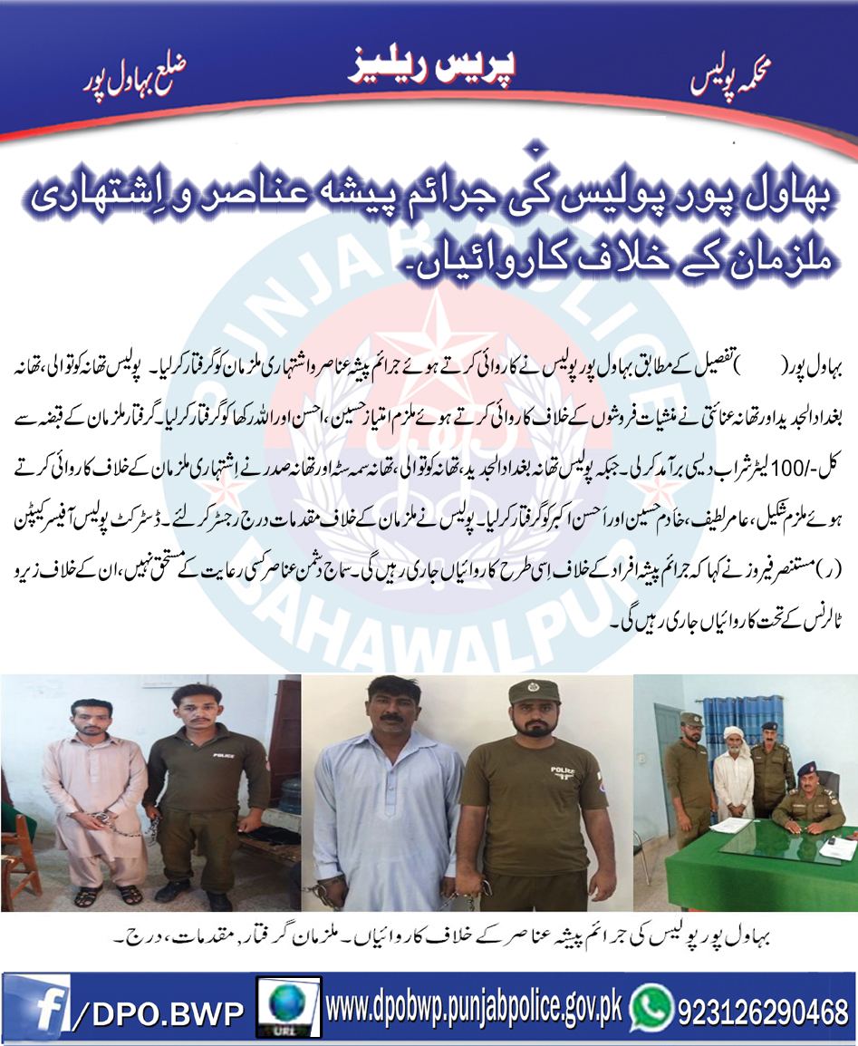 بہاولپور پولیس کی اشتہاری ملزمان و جرائم پیشہ عناصر کے خلاف کاروائیاں جاری۔ ملزمان گرفتار،مقدمات اندراج