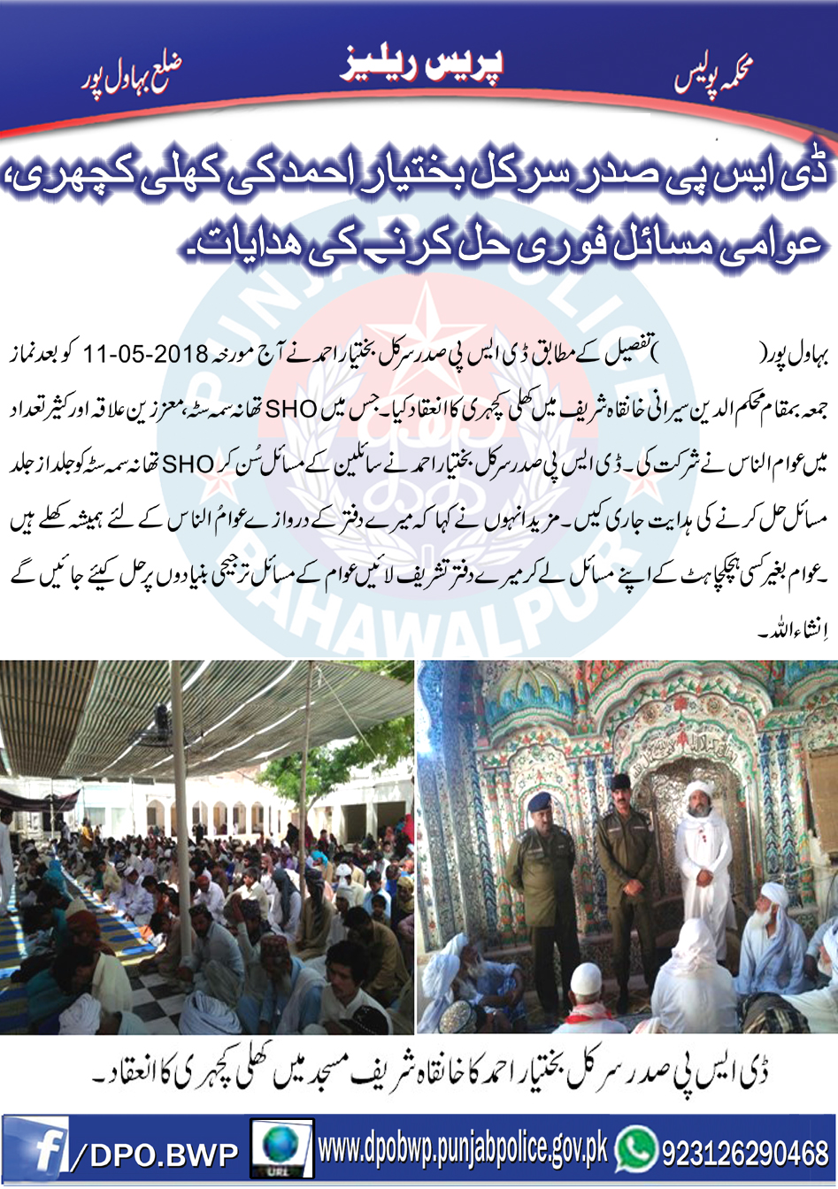 ڈی ایس پی /ایس ڈی پی او صدر سرکل بہاولپور بختیار احمد کی کھلی کچھہری ، عوامی مسائل فوری حل کرنے کی ہدایات ۔