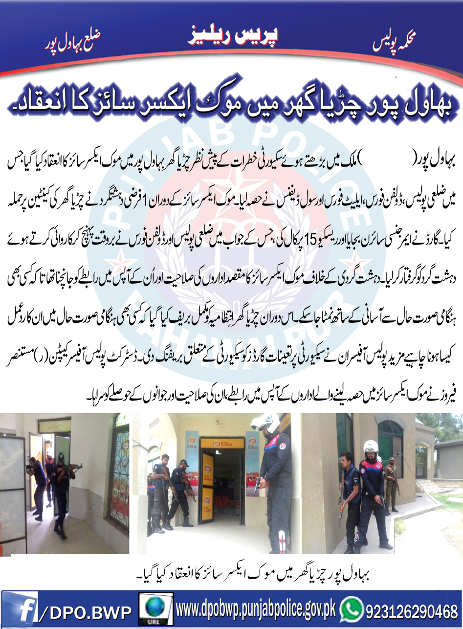 ملک میں بڑھتے ہوۓ سکیورٹی خطرات کے پیشِ نظر چڑیا گھر ﺑﮩﺎﻭﻟﭙﻮﺭ میں موک ایکسر سائز کا انعقاد ۔