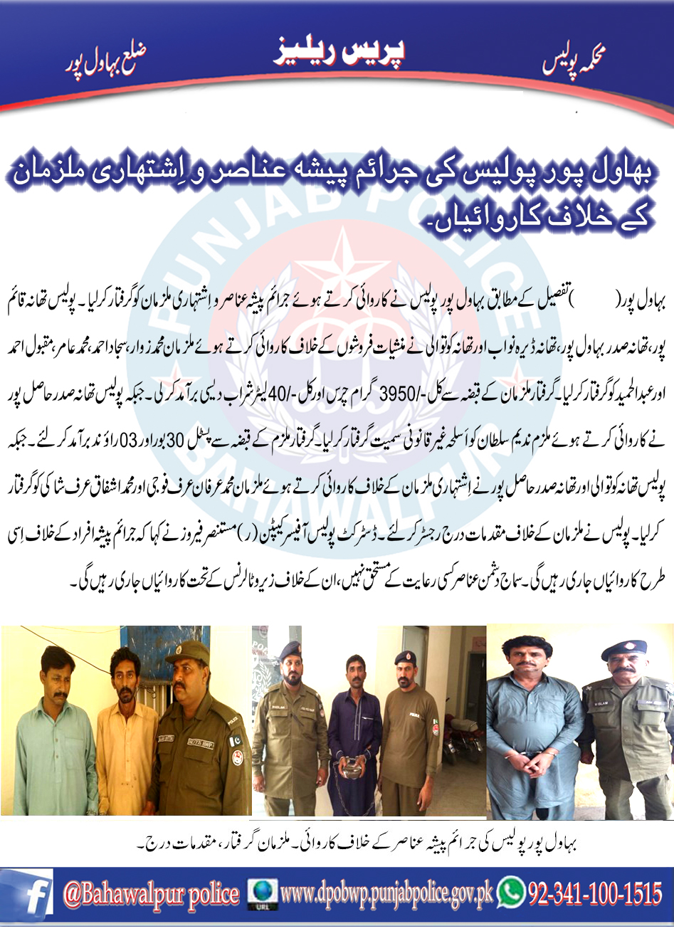 بہاولپور پولیس کی اشتہاری ملزمان و جرائم پیشہ عناصر کے خلاف کاروائیاں جاری،منشیات اور ناجائز اسلحہ برآمد ۔ ملزمان گرفتار،مقدمات اندراج ۔