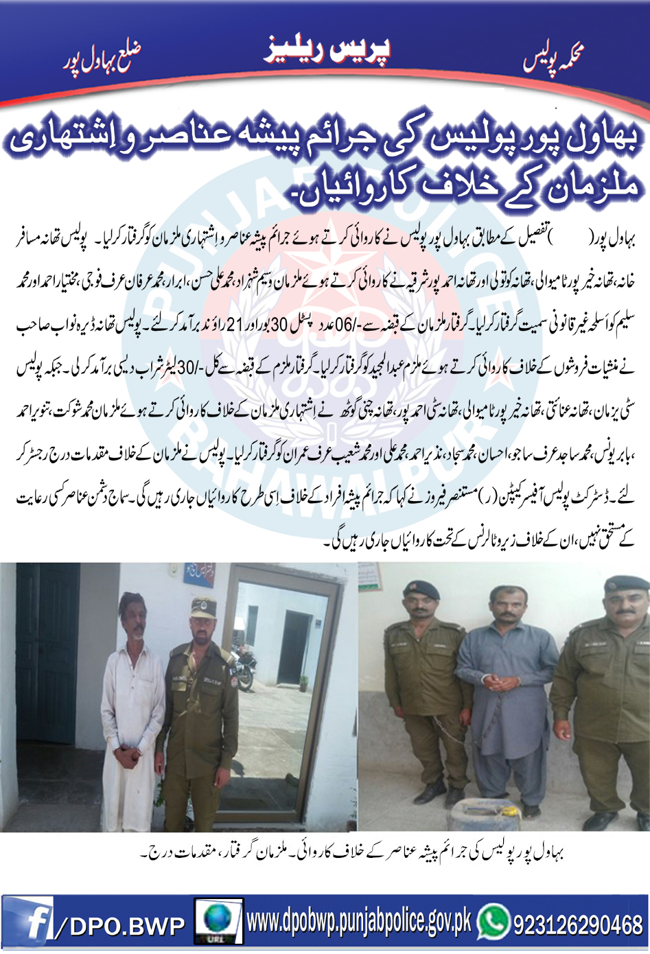 بہاولپور پولیس کی اشتہاری ملزمان و جرائم پیشہ عناصر کے خلاف کاروائیاں جاری،منشیات اور ناجائز اسلحہ برآمد ۔ ملزمان گرفتار،مقدمات اندراج ۔