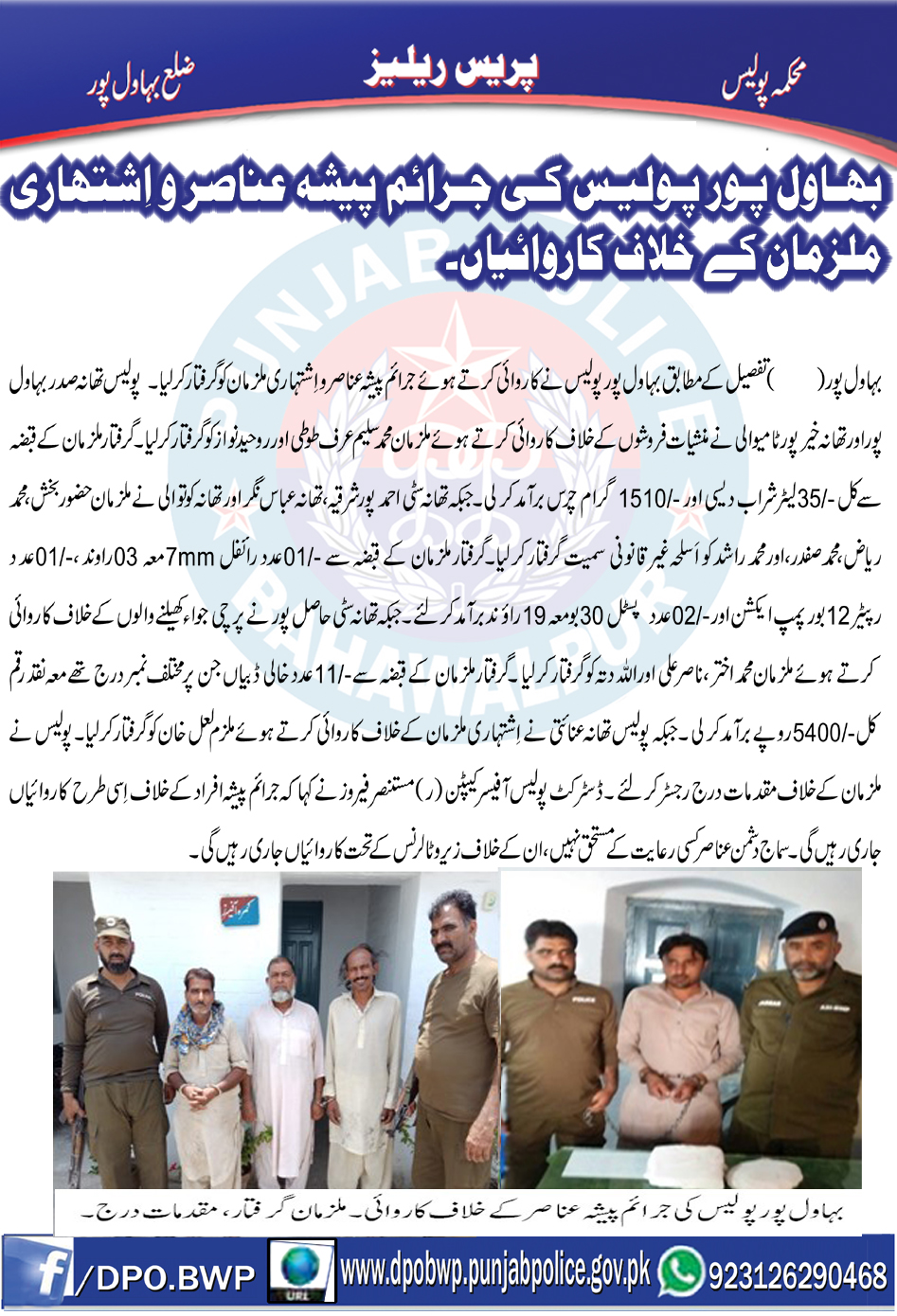 بہاولپور پولیس کی اشتہاری ملزمان و جرائم پیشہ عناصر کے خلاف کاروائیاں جاری،منشیات برآمد ۔ ملزمان گرفتار،مقدمات اندراج ۔ .