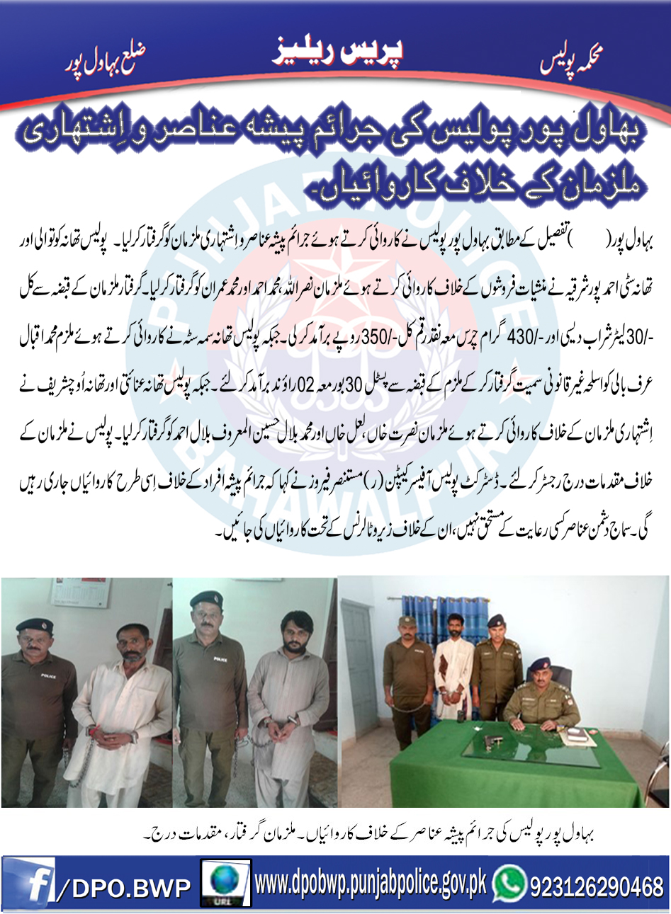 بہاولپور پولیس کی اشتہاری ملزمان و جرائم پیشہ عناصر کے خلاف کاروائیاں جاری،منشیات ، غیرقانونی اسلحہ برآمد ۔ ملزمان گرفتار،مقدمات اندراج ۔ .