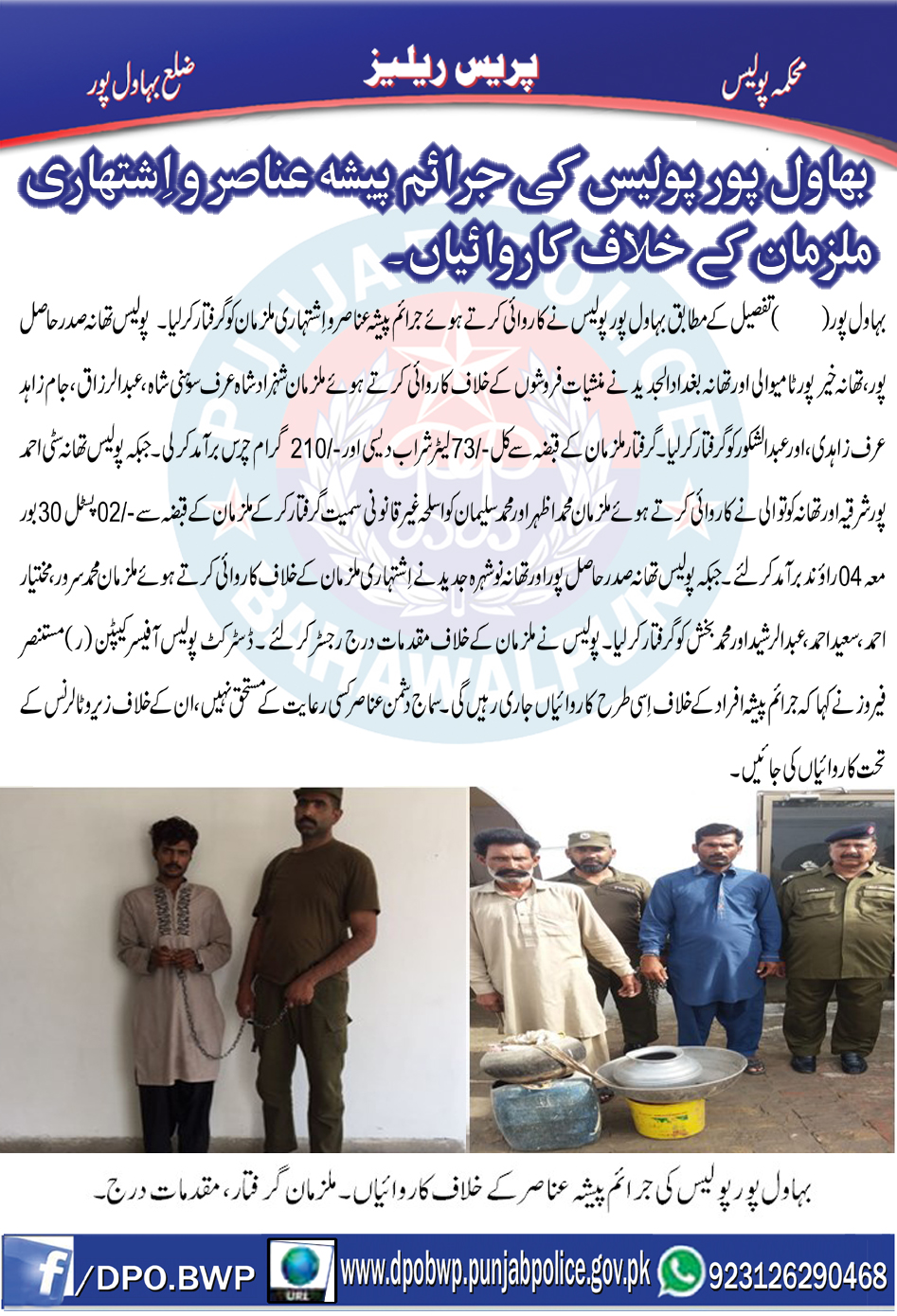 بہاولپور پولیس کی اشتہاری ملزمان و جرائم پیشہ عناصر کے خلاف کاروائیاں جاری ،منشیات ،غیرقانونی اسلحہ برآمد ۔ ملزمان گرفتار،مقدمات اندراج ۔