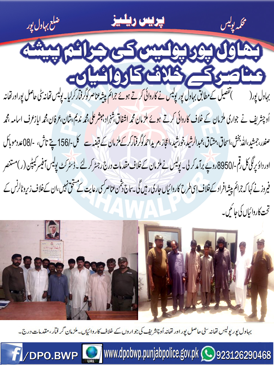 بہاولپور پولیس کی اشتہاری ملزمان و جرائم پیشہ عناصر کے خلاف کاروائیاں جاری ، ملزمان گرفتار،مقدمات اندراج ۔
