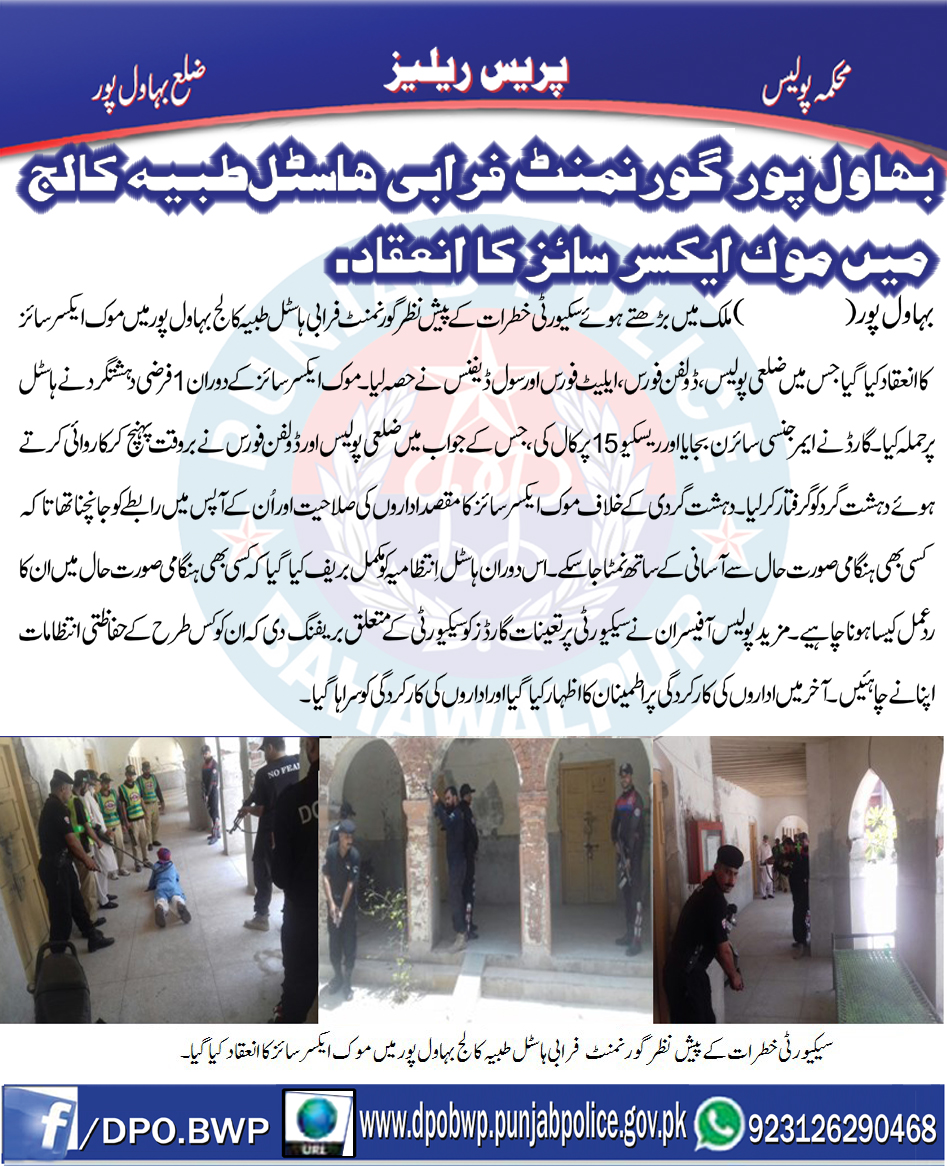 ملک میں بڑھتے ہوۓ سکیورٹی خطرات کے پیشِ گورنمنٹ فرابی ھاسٹل طبیہ کالج ﺑﮩﺎﻭﻟﭙﻮﺭ میں موک ایکسر سائز کا انعقاد
