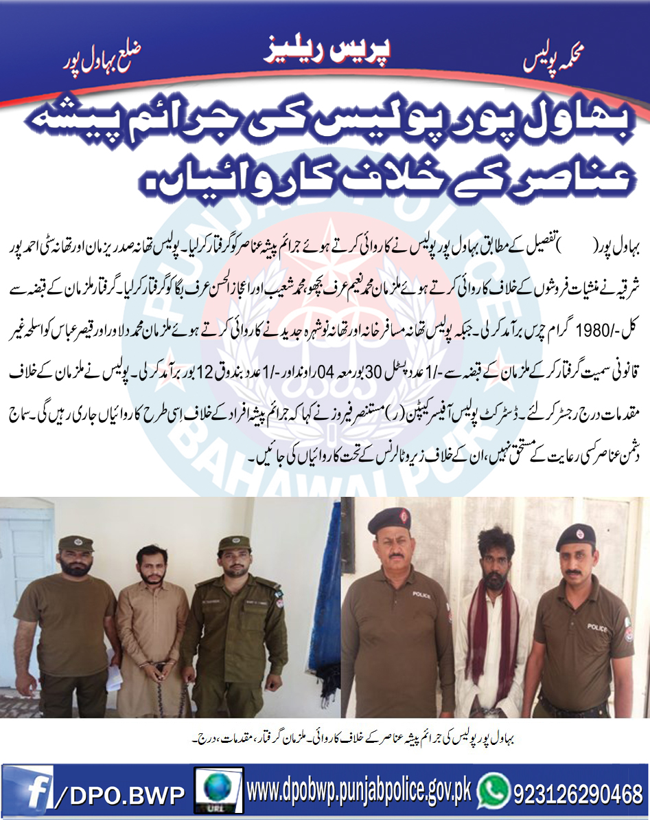 بہاولپور پولیس کی اشتہاری ملزمان و جرائم پیشہ عناصر کے خلاف کاروائیاں جاری ، ملزمان گرفتار،مقدمات اندراج ۔