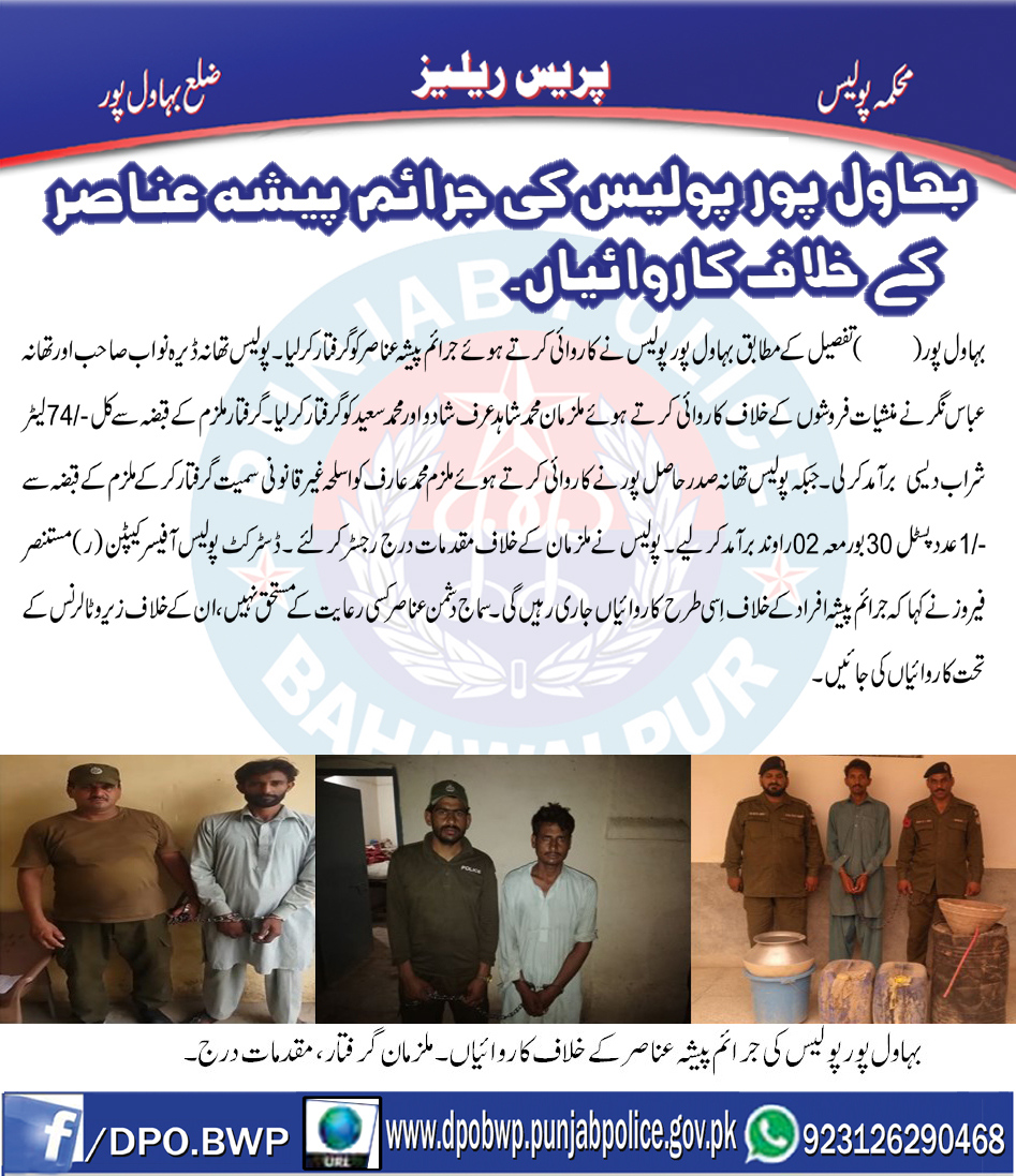 بہاولپور پولیس کی اشتہاری ملزمان و جرائم پیشہ عناصر کے خلاف کاروائیاں جاری ، ملزمان گرفتار،مقدمات اندراج ۔