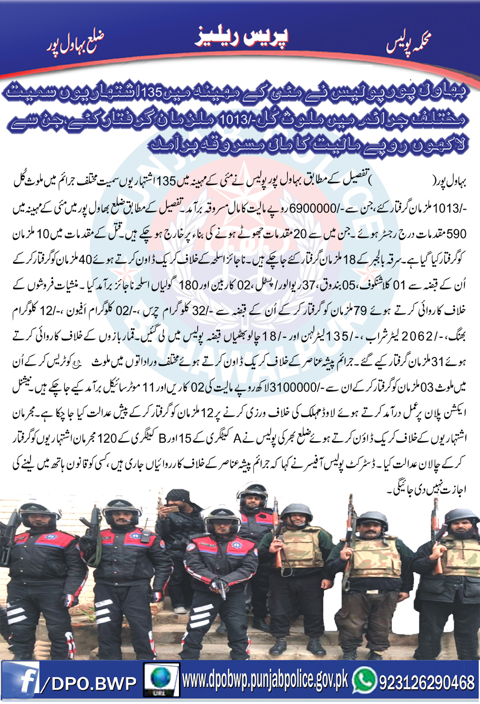 بہاولپور پولیس نے مئی2018 کے مہینہ میں 135اشتہاریوں سمیت مختلف جرائم میں ملوث1014ملزمان گرفتار کیے جن سے لاکھوں روپے مالیت کامال مسروقہ برآمدکیا۔