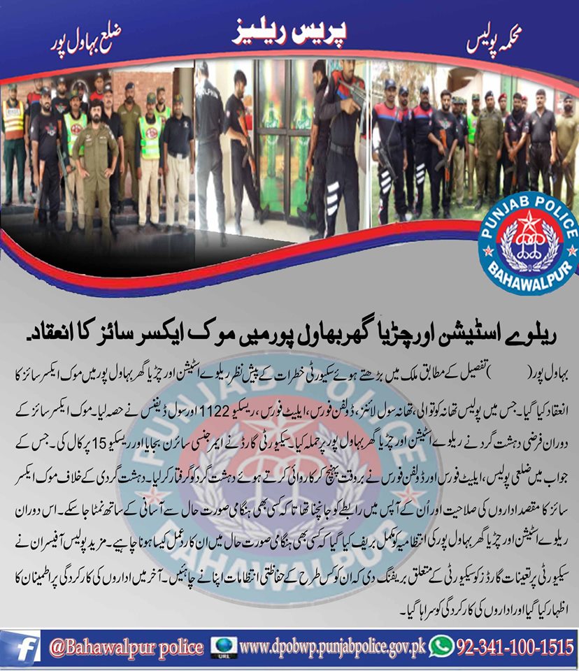 ملک میں سکیورٹی خطرات کے پیش نظر بہاولپور پولیس کا ریلوے اسٹیشن بہاولپور اور چڑیا گھر بہاولپور پر موک ایکسرسائز کا انعقاد ۔