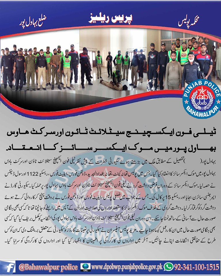 ملک میں سکیورٹی خطرات کے پیش نظر بہاولپور پولیس کا ٹیلی فون ایکسچینج سٹلائیٹ ٹاؤن بہاولپور اور سرکٹ ہاؤس بہاولپور پر موک ایکسرسائز کا انعقاد ۔