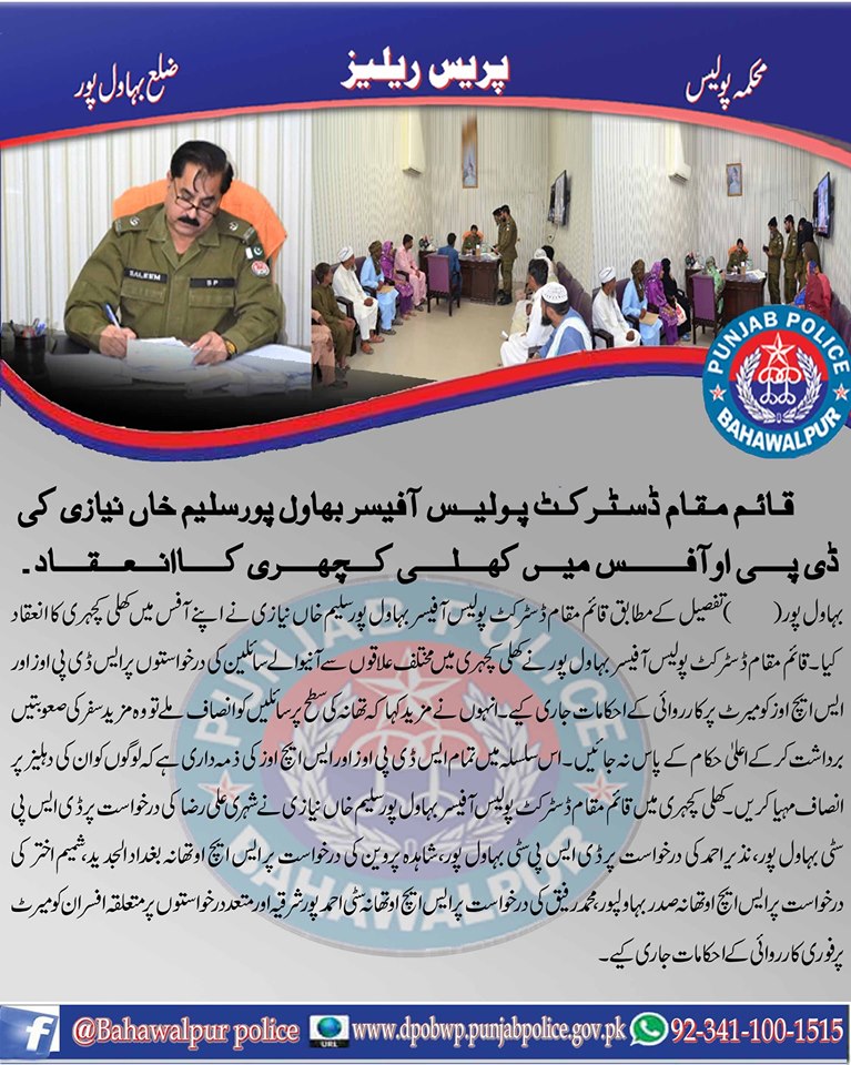 قائم مقام ڈسٹرکٹ پولیس آفیسر بہاولپور محمد سلیم خان نیازی کا ضلعی پولیس دفتر بہاولپور میں کھلی کچہری کاانعقاد ،مختلف علاقوں سے آنے والے سائلین کی درخواستوں پرایس ڈی پی اوز اور ایس ایچ اوز کو میرٹ پر کاروائی کے احکامات جاری۔