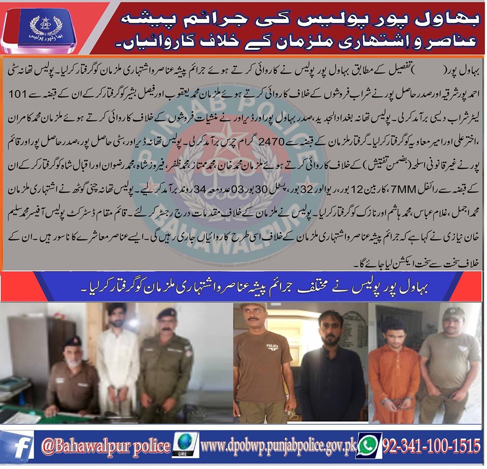 بہاولپور پولیس کا جرائم پیشہ عناصر و اشتہاری ملزمان کے خلاف کاروائیاں جاری