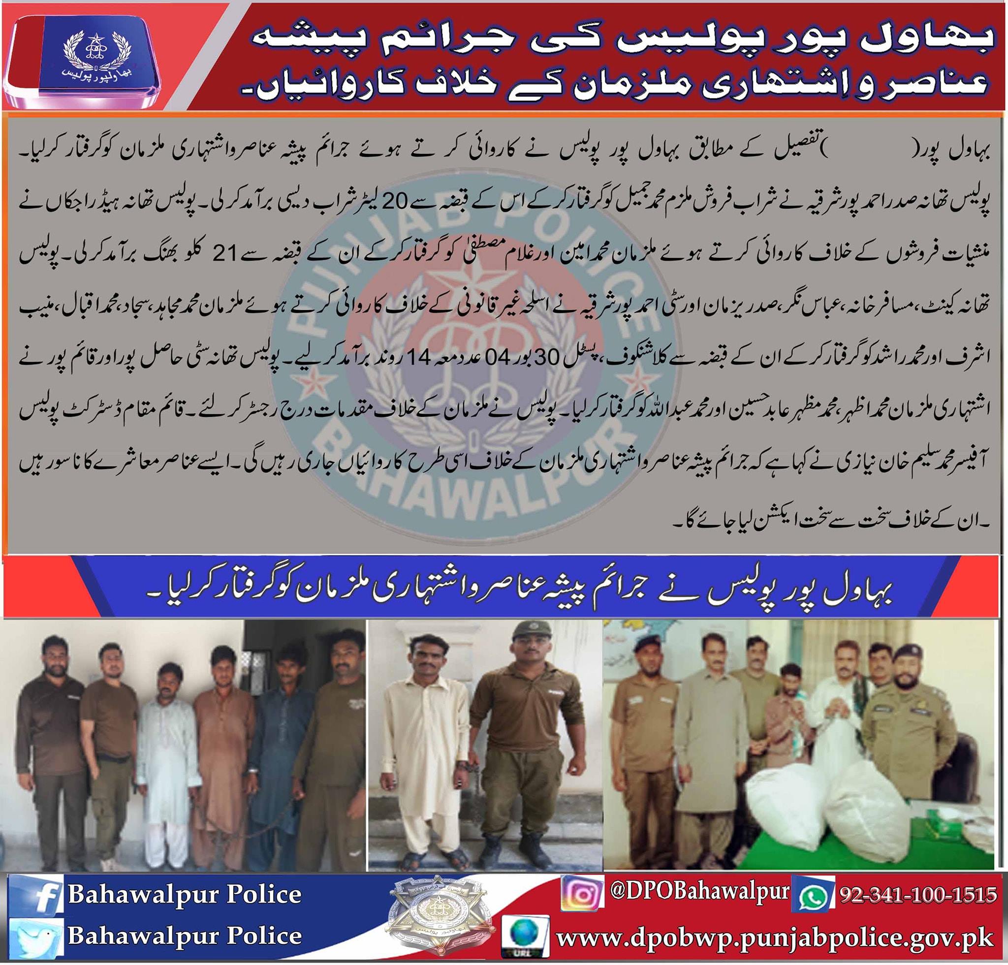 بہاولپور پولیس کا جرائم پیشہ عناصر و اشتہاری ملزمان کے خلاف کاروائیاں جاری