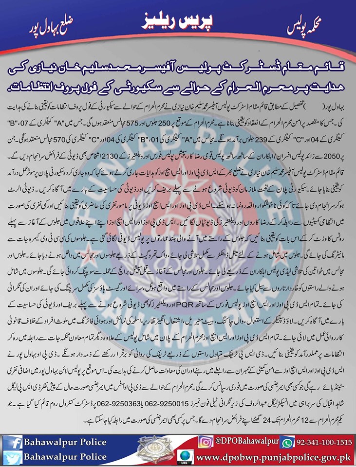 قائم مقام ڈسٹرکٹ پولیس آفیسر محمد سلیم خان نیازی کی ہدایت پر محرم الحرام کے حوالے سے سکیورٹی کے فول پروف انتظامات، شاہد اقبال ڈی ایس پی کی سربراہی میں انسپکٹر عبدالراؤف کی نگرانی میں ٹیلیفون نمبر 0629250363 یا0629250015 پر ڈسٹرکٹ کنٹرول روم قائم۔