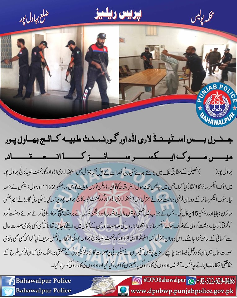 ملک میں سکیورٹی خطرات کے پیش نظر بہاولپور پولیس کا جنرل بس اسٹینڈ لاری اڈہ بہاولپور اور گورنمنٹ طبیہ کالج بہاولپور پر موک ایکسرسائز کا انعقاد ۔