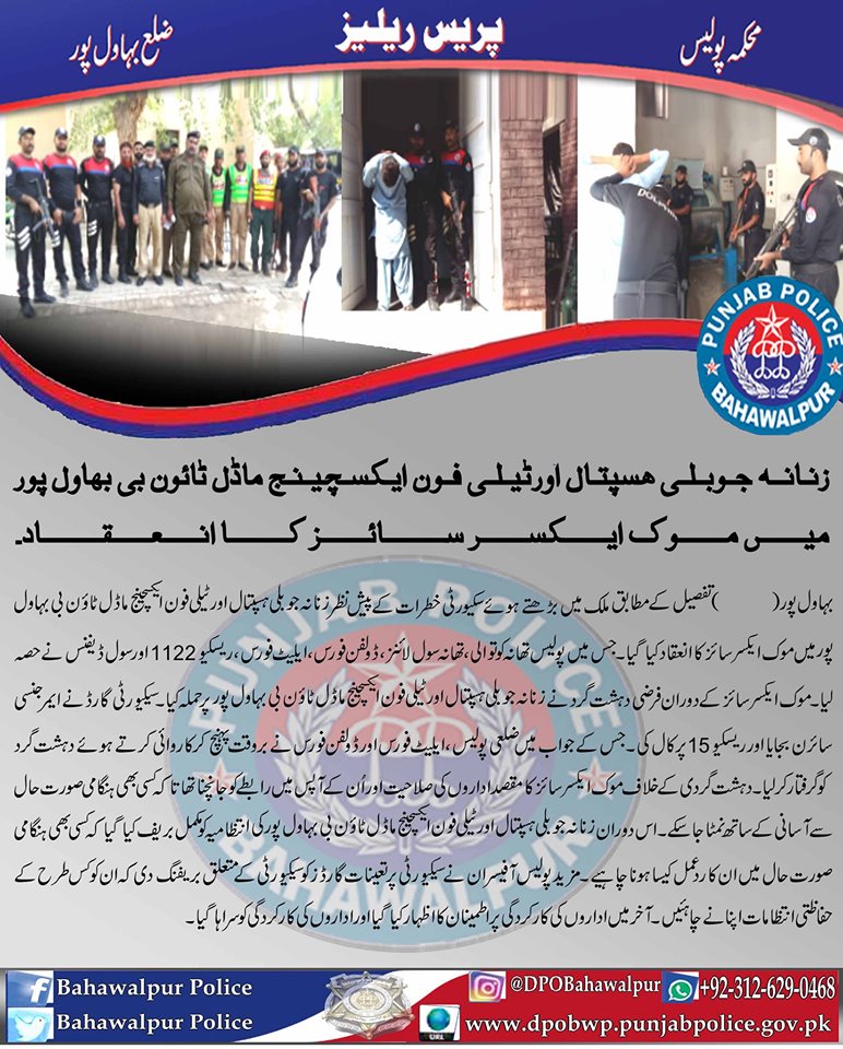 ملک میں سکیورٹی خطرات کے پیش نظر بہاولپور پولیس کا زنانہ جوبلی ہسپتال بہاولپور اور ٹیلیفون ایکسچینج ماڈل ٹاؤن بی بہاولپور پر موک ایکسرسائز کا انعقاد ۔
