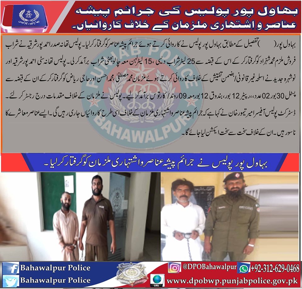 بہاولپور پولیس کا جرائم پیشہ عناصر و اشتہاری ملزمان کے خلاف کاروائیاں جاری