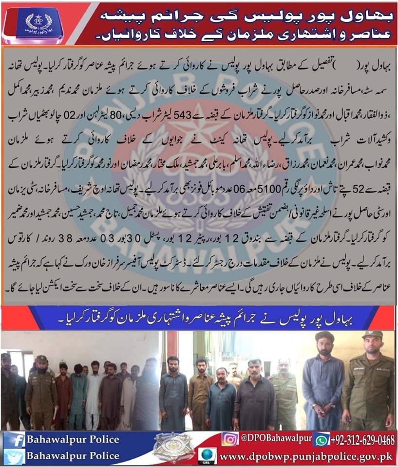 ڈسٹرکٹ پولیس آفیسر سرفراز خان وِرک کی ہدایت پر ضلع بھر میں جرائم پیشہ عناصر و اشتہاتی ملزمان کے خلاف کریک ڈاؤن جاری