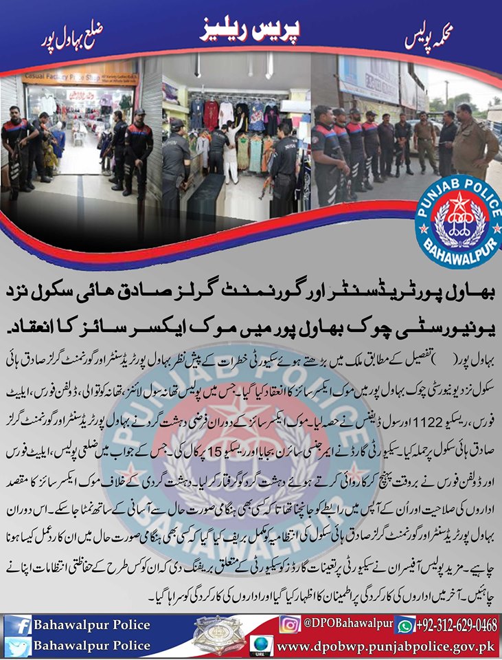 ملک میں سکیورٹی خطرات کے پیش نظر بہاولپور پولیس کا ٹریڈسنٹربہاولپور اور گورنمنٹ گرلز صادق ھائی اسکول نزد یونیورسٹی چوک بہاولپور پر موک ایکسرسائز کا انعقاد ۔