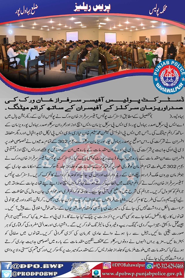 ڈسٹرکٹ پولیس آفیسر سرفراز خان ورک کی ایس پی انوسٹی گیشن سلیم خان نیازی کے ہمراہ صدرسرکل بہاولپوراوریزمان سرکل کےایس ڈی پی اوز ،ایس ایچ اوز اور تفتیشی آفسران کے ساتھ کرائم بریفنگ میٹنگ۔