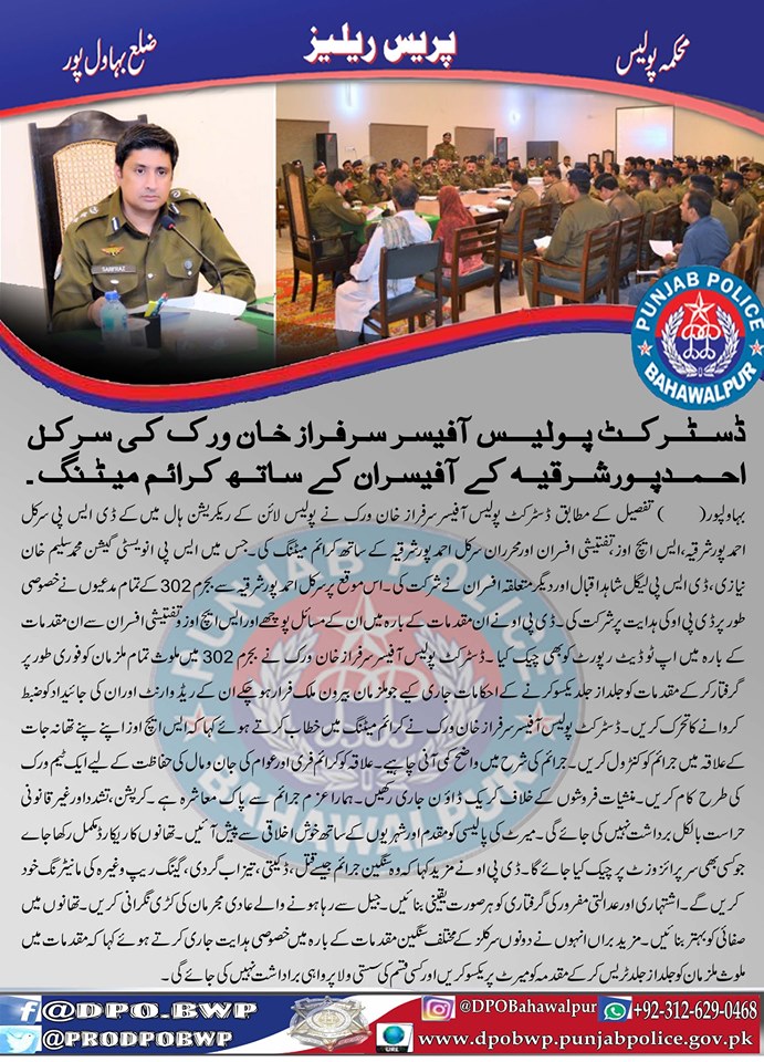 ڈسٹرکٹ پولیس آفیسر سرفراز خان ورک کی ایس پی انوسٹی گیشن سلیم خان نیازی کے ہمراہ سرکل احمدپورشرقیہ کےایس ڈی پی او ،ایس ایچ اوز، تفتیشی آفسران اور محرران کے ساتھ کرائم میٹنگ۔