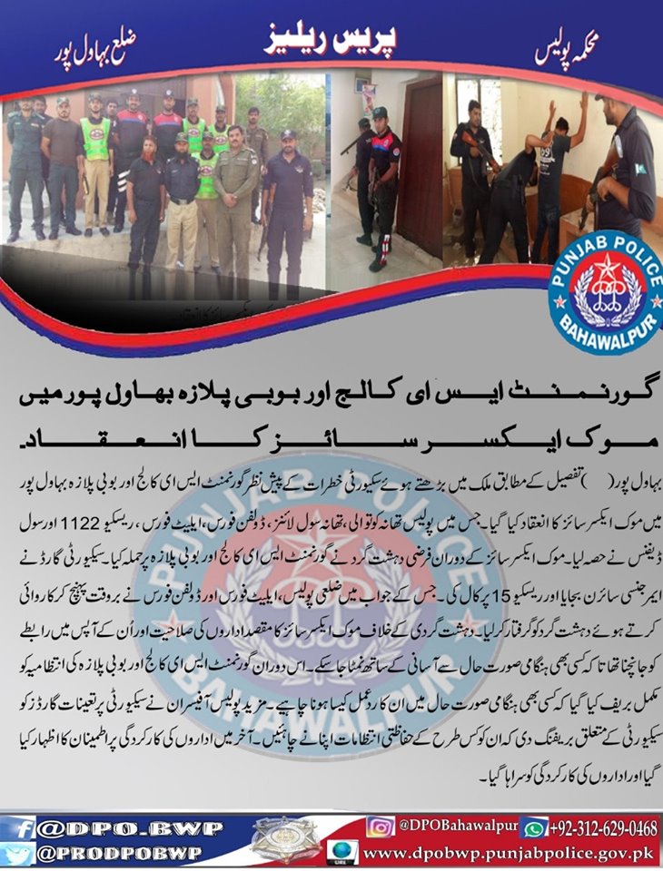 ملک میں سکیورٹی خطرات کے پیش نظر بہاولپور پولیس کا گورنمنٹ ایس ای کالج بہاولپور اور بوبی پلازہ بہاولپور پر موک ایکسرسائز کا انعقاد ۔