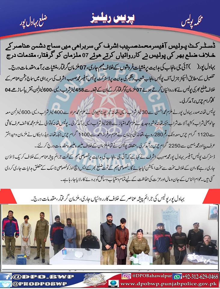 ڈسٹرکٹ پولیس آفیسر بہاولپورکی سربراہی میں سماج دشمن عناصر کے خلاف ضلع بھر کی پولیس نے کارروائیاں کرتے ہوۓ ،07 ملزمان گرفتار،مقدمات درج۔