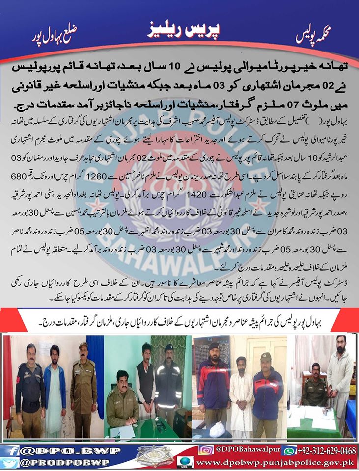 تھانہ خیرپور ٹامیوالی پولیس نے 10 سال بعد،تھانہ قائمپور پور پولیس 2مجرمان اشتہاری کو 03 ماہ بعد جبکہ منشیات اور اسلحہ غیر قانونی میں ملوث 07 ملزمان گرفتار، منشيات اور اسلحہ ناجائز برآمد،مقدمات درج۔